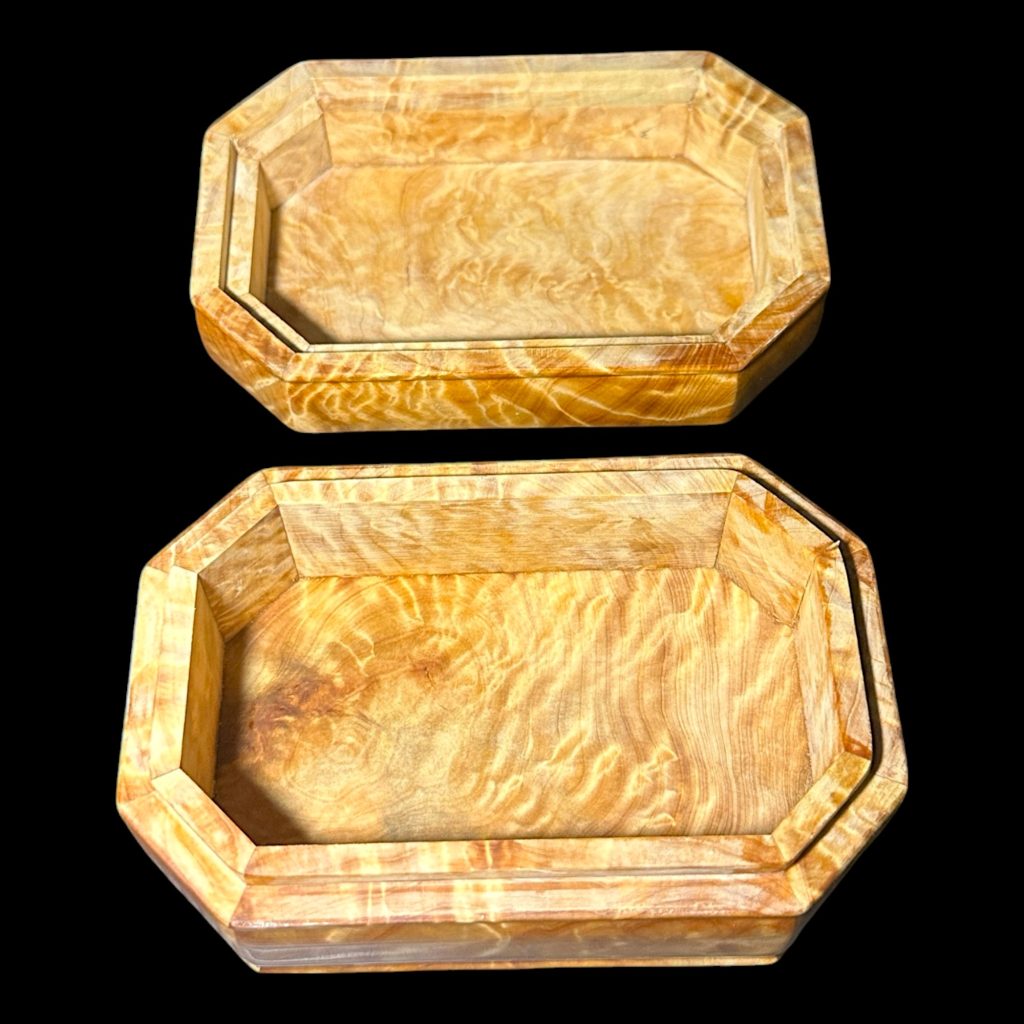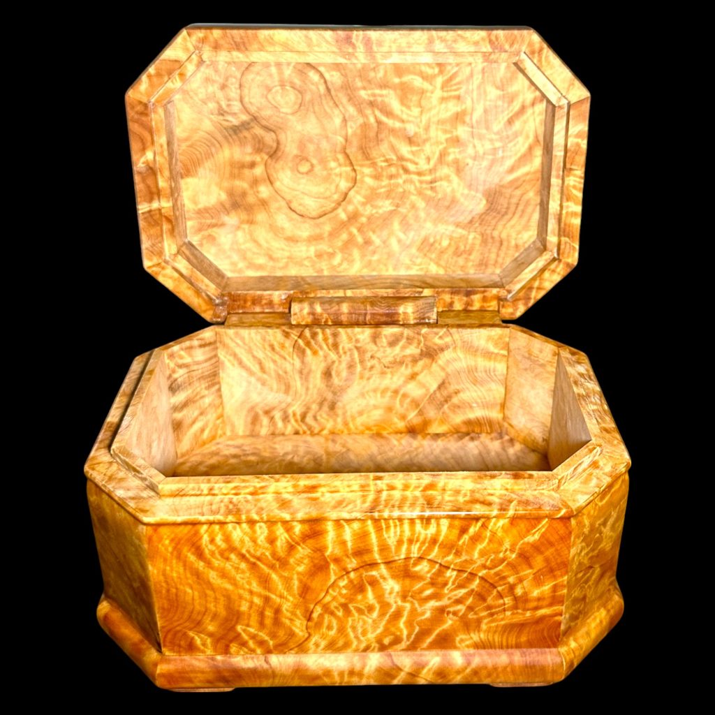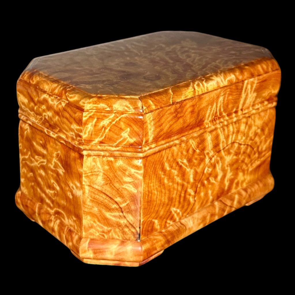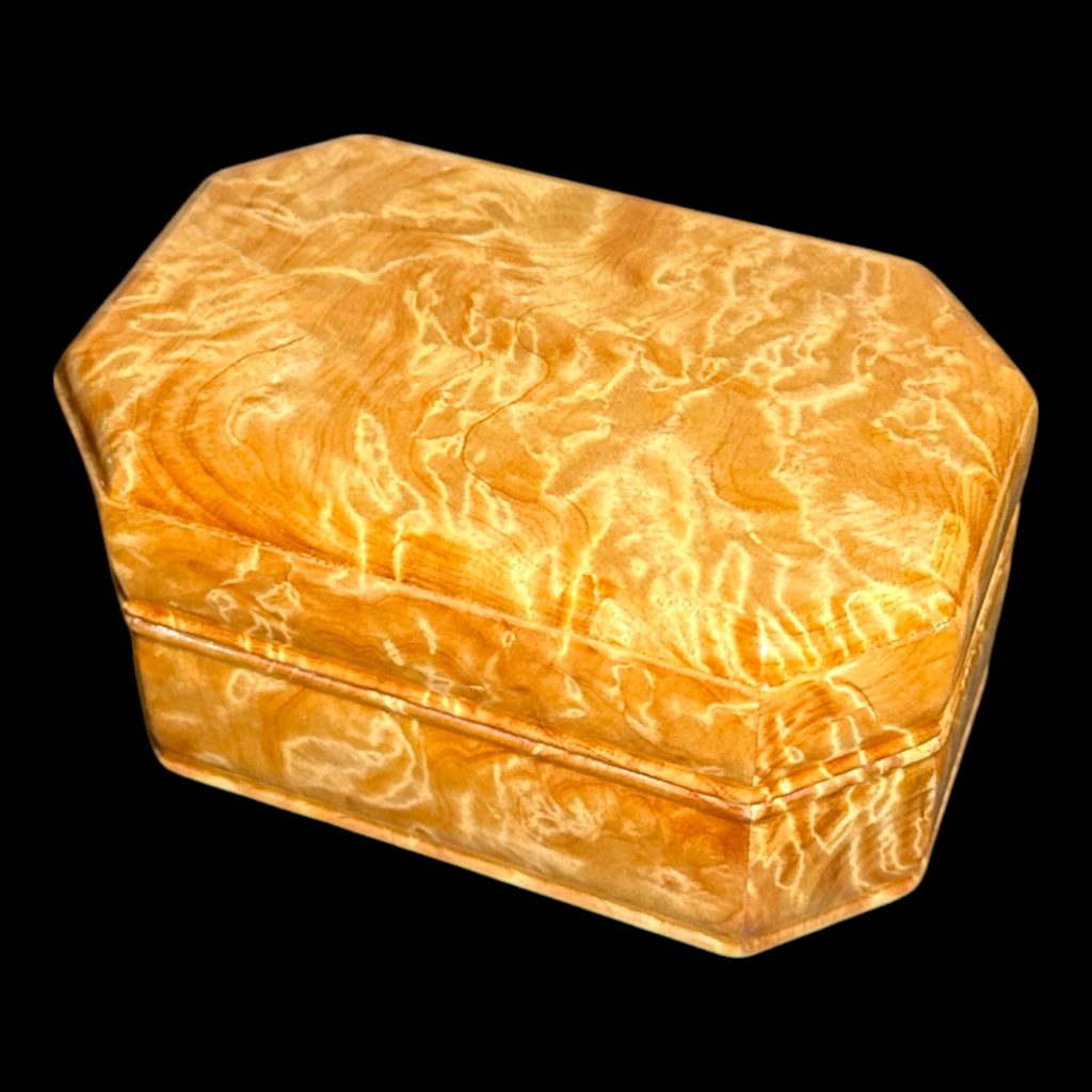 這款珠寶盒除了滿滿的瘤花,還是全手工打造,配上業界頂級的二林鋼琴烤漆,讓瘤花更立體,層次感與光澤感極佳(盒底消光漆,盒身盒蓋亮光漆,內盒無噴漆)。它不僅是珠寶盒,更是可擺在家中的藝術品,吸引客人目光,瞬間提升格調。
