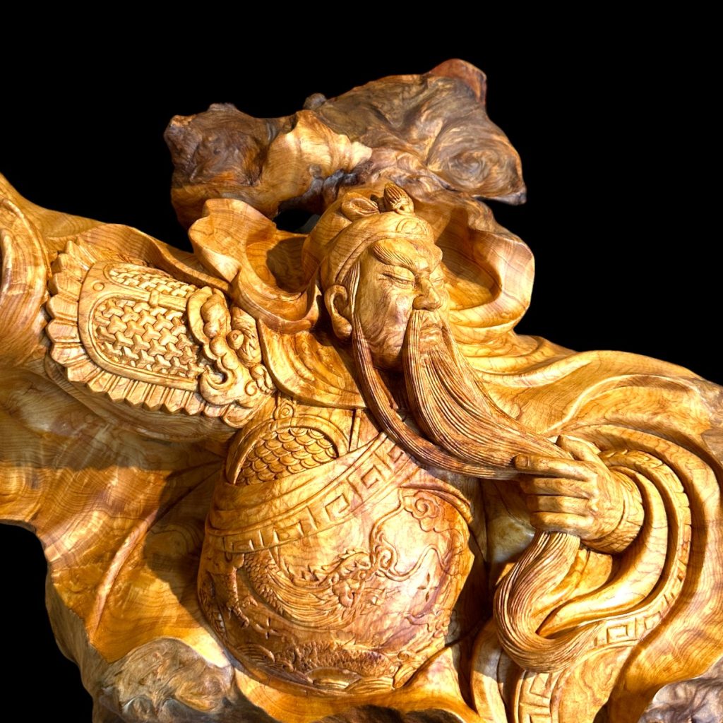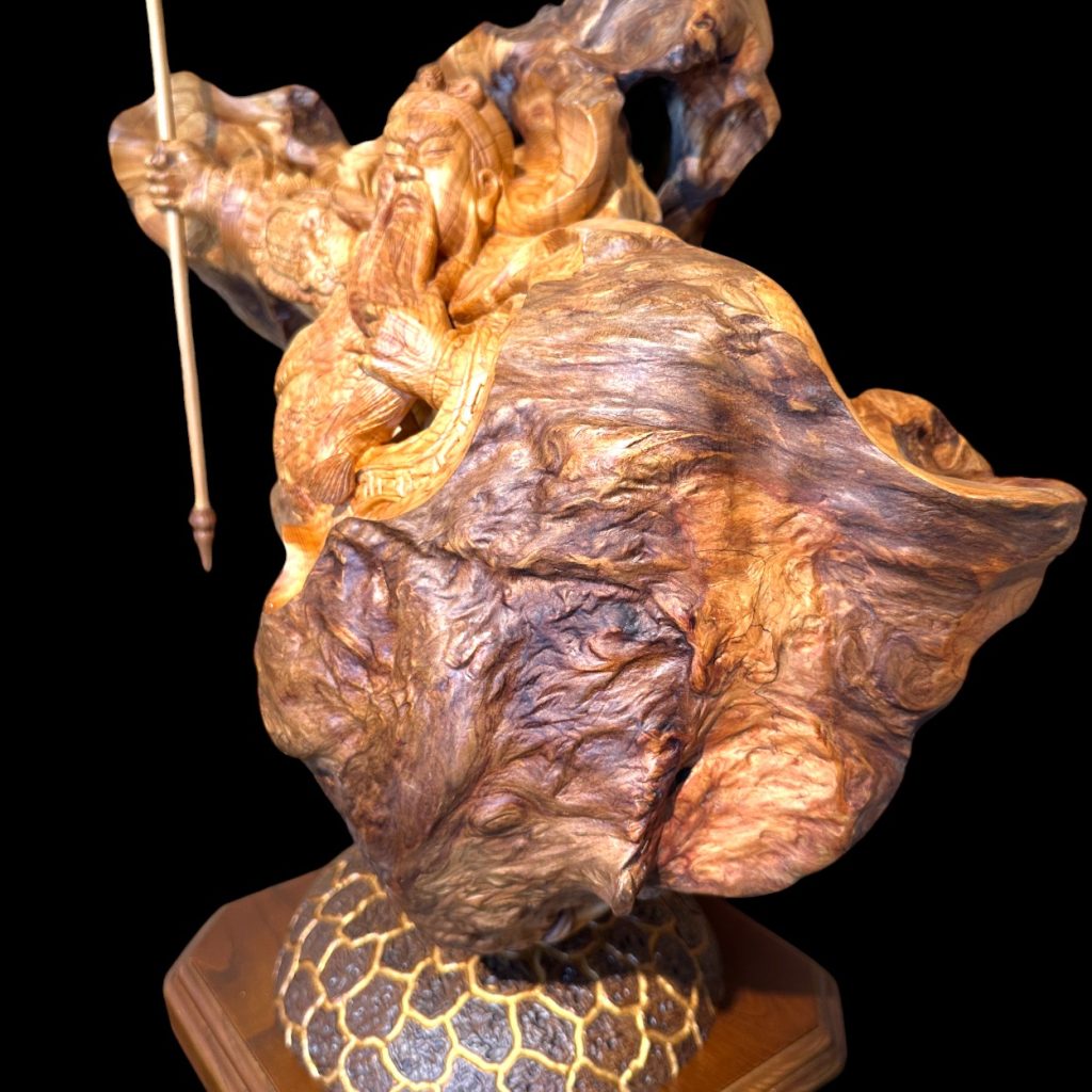 利用鳳尾瘤木空心特色展現關公忠義與智慧的精神力量。空心設計象徵無私、無我、永恆的忠義,彷彿關公跨越千年依然守護著勇氣與信念。這不僅是精美的藝術品,更是品味與文化的象徵,為您的家增添精神與格調的力量。