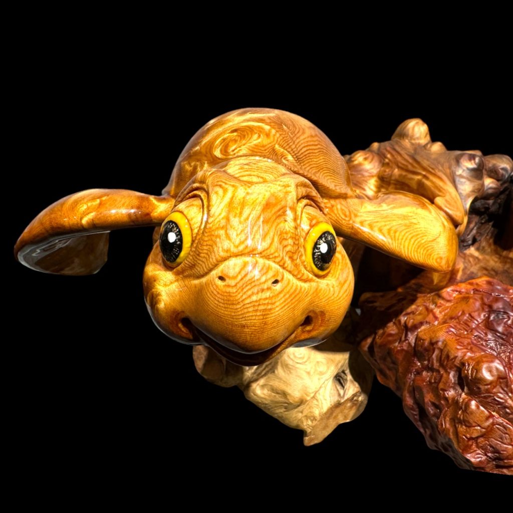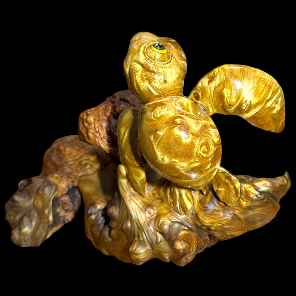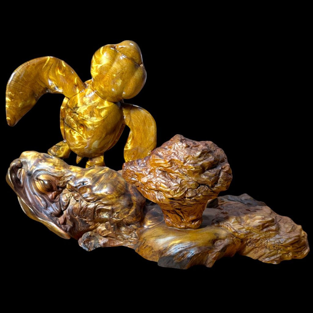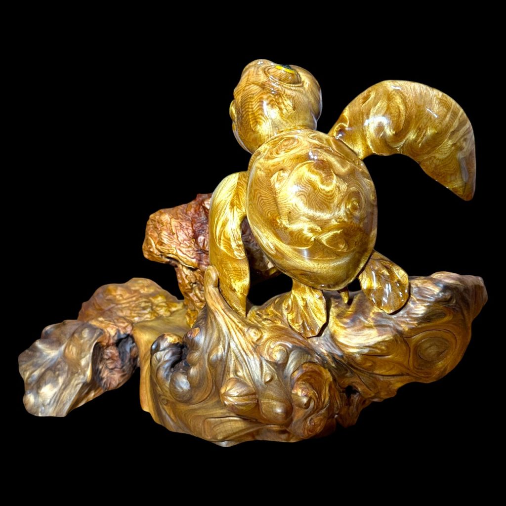 在海岩上悠然攀爬的海龜,如大自然親手雕琢般栩栩如生。這件作品採用極為稀少的台灣硬骨紅檜,堅硬且細膩,每一公分需15至20年的成長,讓這種材質更顯珍貴。其突出的鳳尾瘤皮,宛如天然石雕,與海龜造型完美相融,將自然與藝術的和諧展現得淋漓盡致。這不僅是木雕,更是承載時間與生命的藝術珍品。